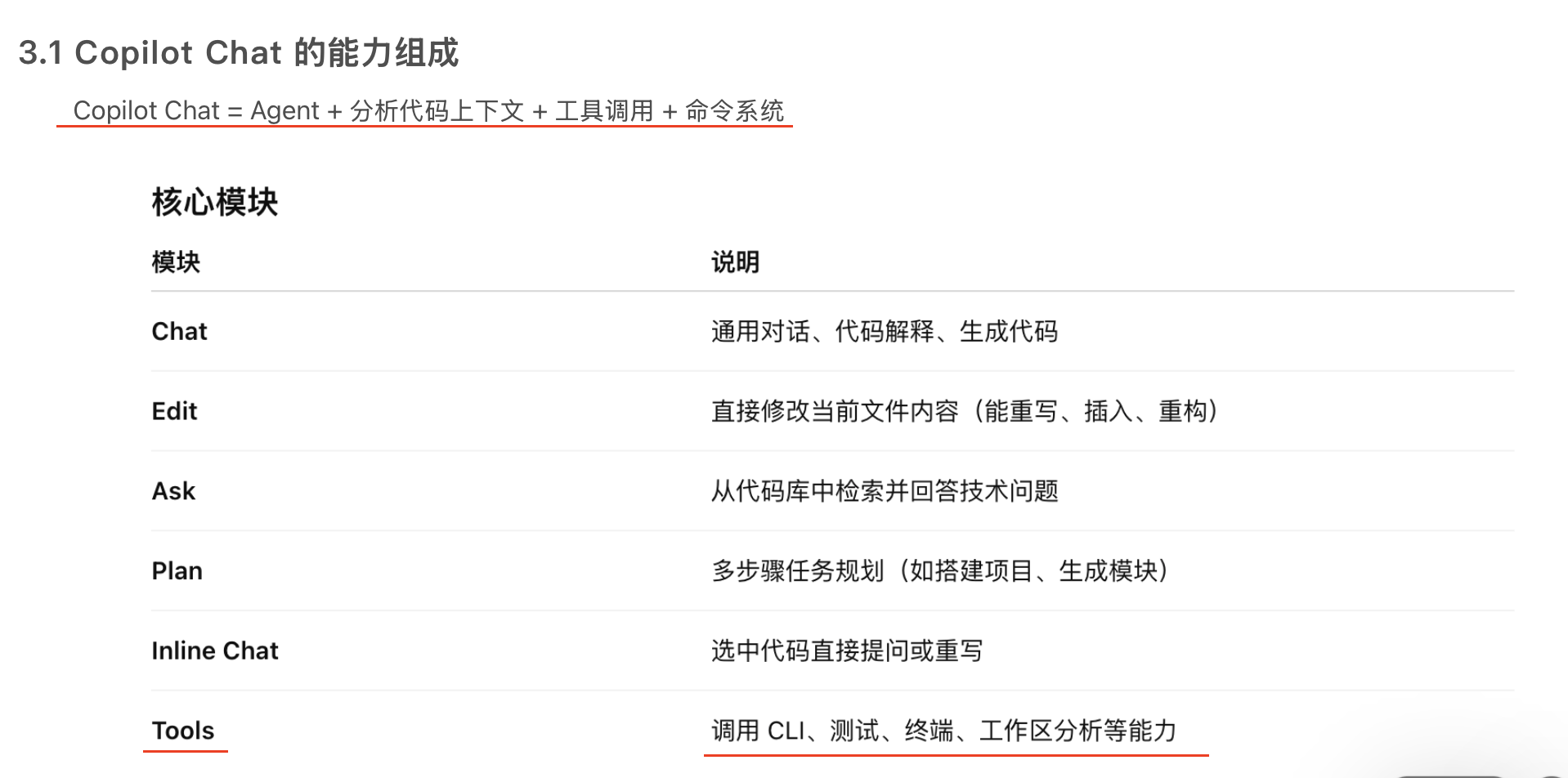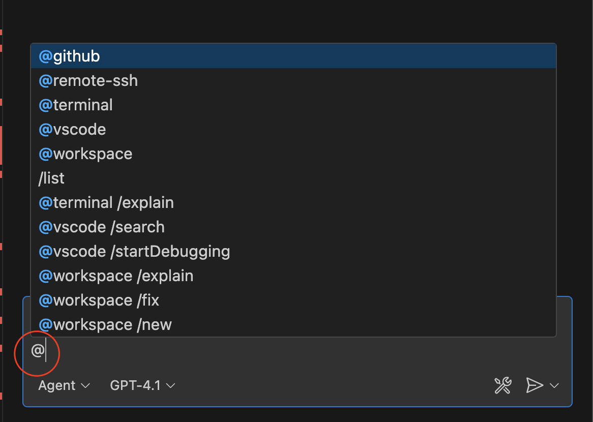 说明:@ 是 Copilot Chat 的"工具调用系统",属于高级用法。它让 Copilot 像一个真正的 IDE Agent,能调 Workspace、终端、Git、容器等。
