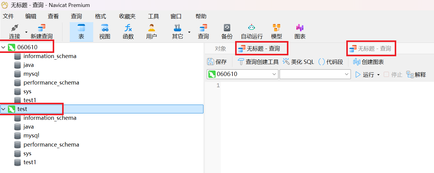 这里使用Navicat建立两个连接,两个连接分别创建一个查询来表示两个事务