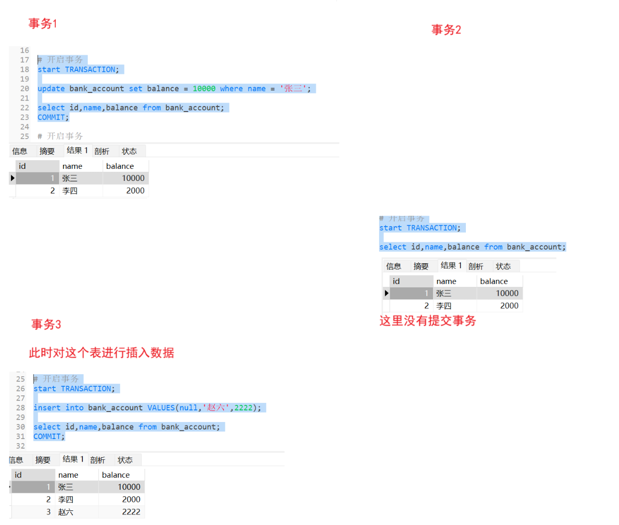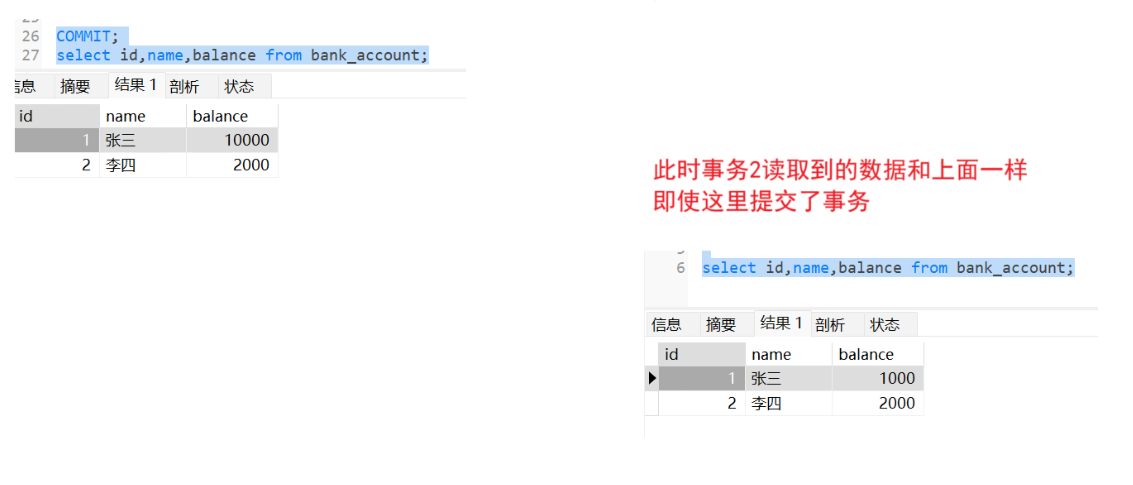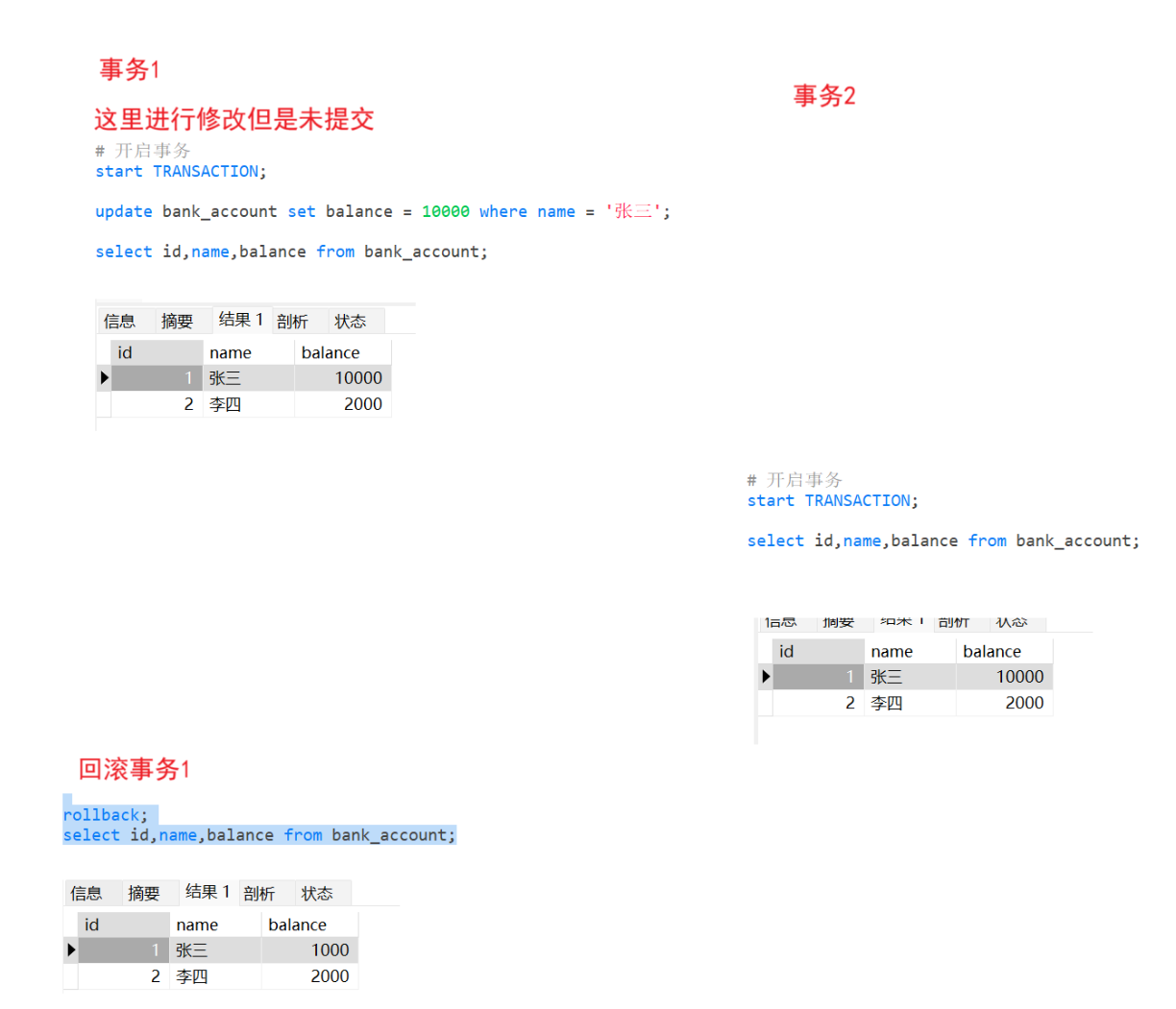 此时这里将张三余额设置成10000,事务2读取到了这个修改,但是事务1将其回滚,此时事务2那10000这条数据进行后面操作就是错误的