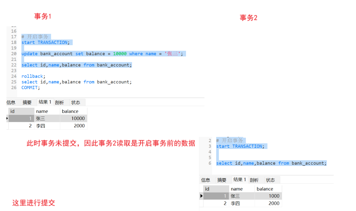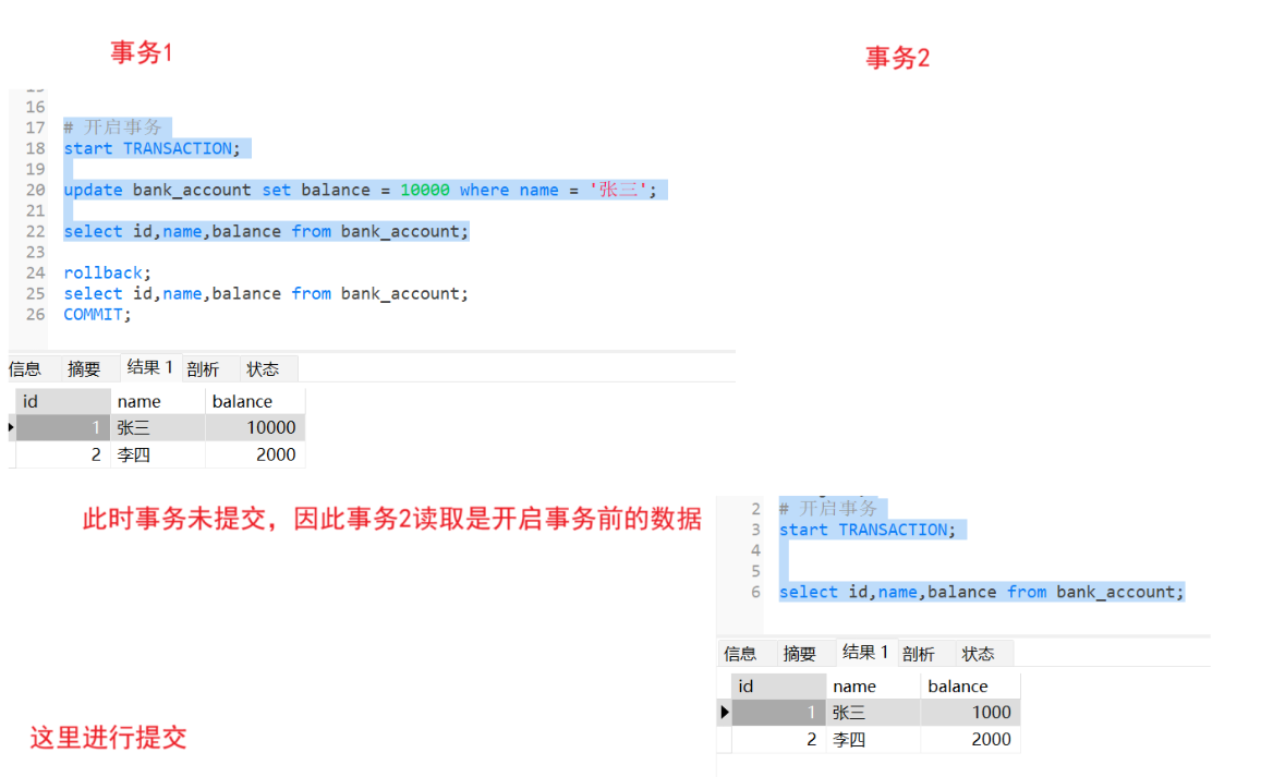 例如:事务1执行一条修改UPDATE操作,但是没有执行COMMIT提交