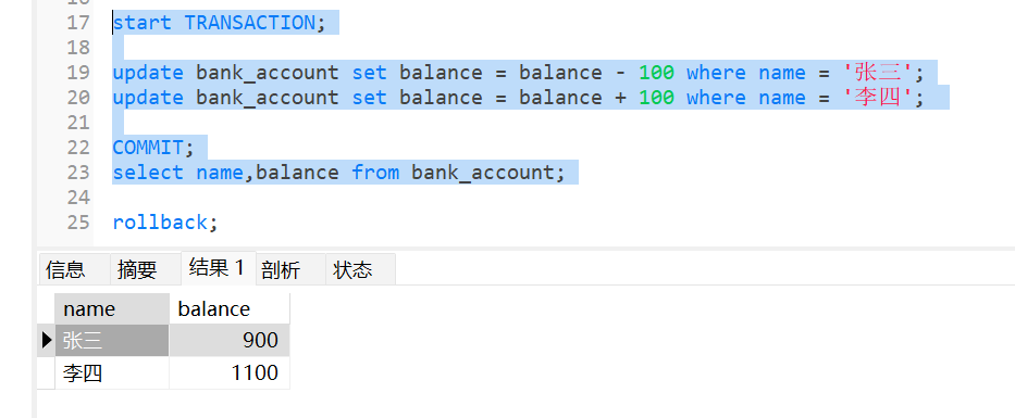 此时这里张三账户减少100变成了900,李四增加100变成1100