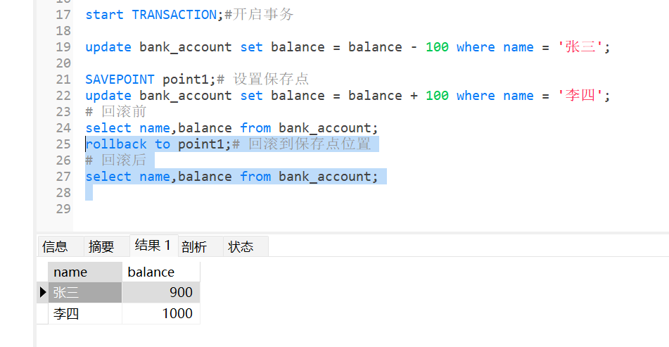 这里回滚到修改李四数据前面,所以此时张三余额-100,因为回滚此时李四余额没变