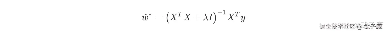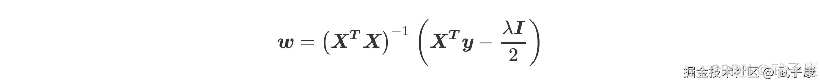 否则矩阵 XTX+λI 永远都是满秩,在 sklearn 中,λ的值我们可以自由的控制,因此我们可以让它不为 0,比避免第一种情况。而第二种情况,如果我们发现某个λ的取值下模型无法求解,那我们只需要更换一个λ的取值就好了,也可以顺利避免。也就是说,矩阵的逆永远存在,有这个保障,我们的 w 就可以写作: