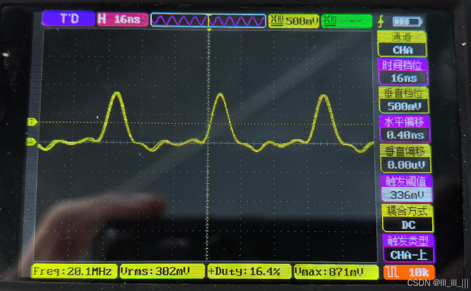 电压很小大概800mv左右 按照上面代码,系统时钟120Mhz,6分频之后输出20mhz