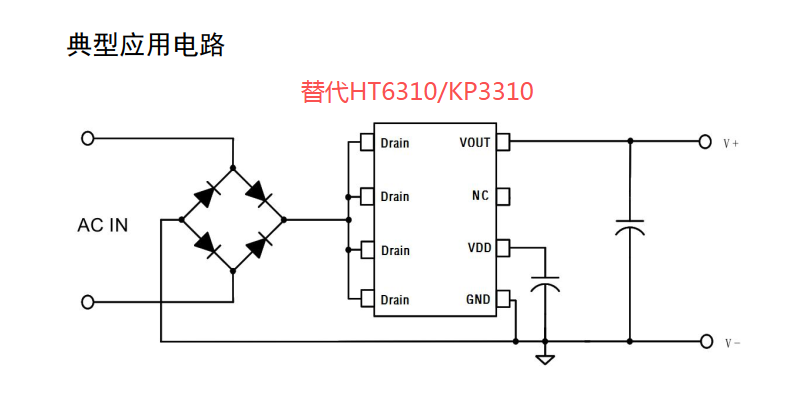 **PC6310 是一款紧凑型无电感设计的离线式线性稳压器。PC6310 输出电压已由内部设定为 5V/3.3V/2.7V 三个版本。PC6310 是一种简单可靠的获得偏置供电的离线式电源解决方案。PC6310 集成了 650V 功率 MOSFET,启动控制电路,VDD 电压控制电路,AC交流信号同步检测电路,低压差稳压器等。该芯片通过智能控制交流能量输入以减小系统损耗,提高系统效率,同时有效降低系统待机。PC6310 集成有完备的带自恢复功能的保护功能:VDD 欠压保护,VDD 过压保护,输出过载保护,输出欠压保护,**雷击浪涌保护和内置过温保护等。