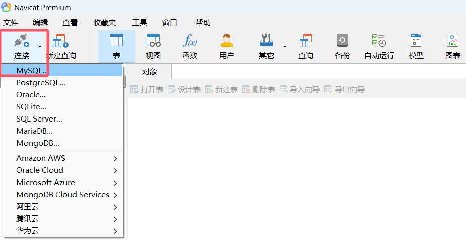 打开navicat软件,点击"连接",选择"MySQL":