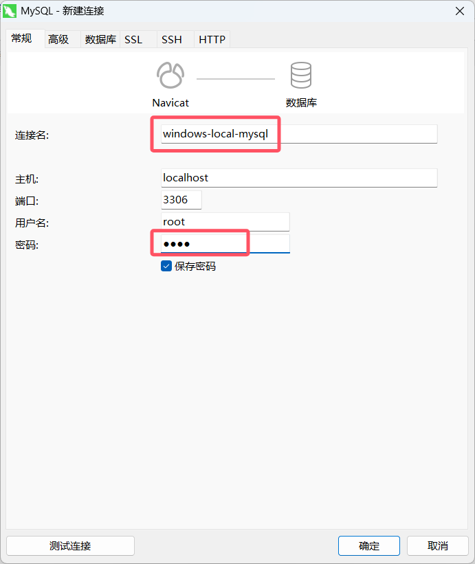 设置连接名,输入密码(主机就是本机,端口和用户名默认):