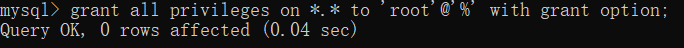 grant all privileges on *.* to 'root'@'%' with grant option;