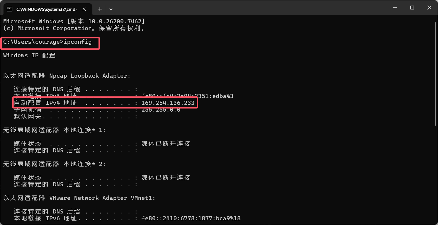 Win+R键输入cmd,输入ipconfig查看远程主机ip地址并进行连接: