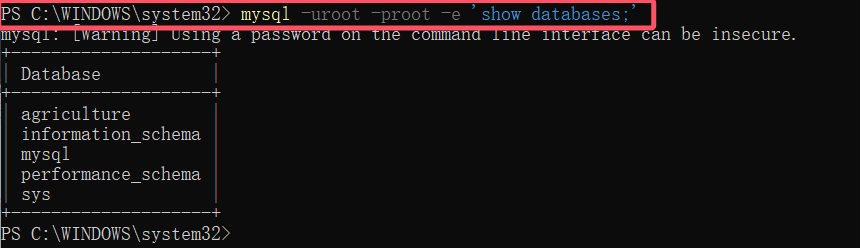 mysql -uroot -proot -e 'show databases;'