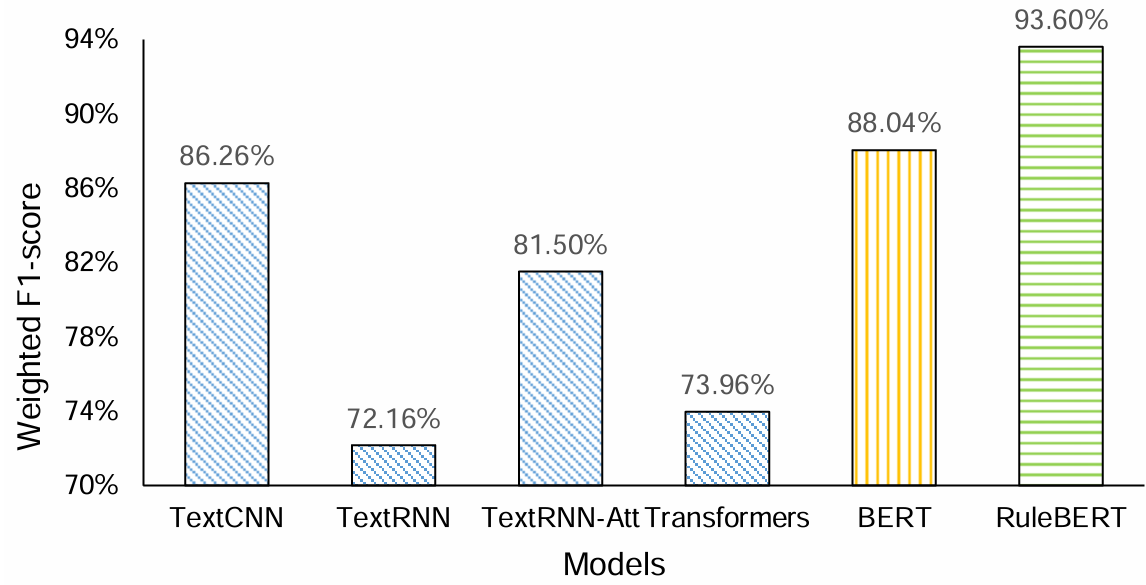用领域语料预训练得到RuleBERT模型,自动分类条款可解释性,F1-score达93.60%,优于传统模型。