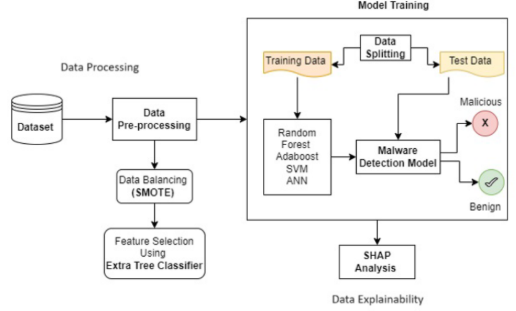 **方法:**论文通过 SMOTE 技术处理数据失衡、Extra Trees Classifier 筛选特征,训练随机森林、AdaBoost 等机器学习模型进行恶意软件检测,并结合 SHAP 框架,通过计算 Shapley 值明确各特征的全局与局部贡献,提升模型可解释性与透明度。
