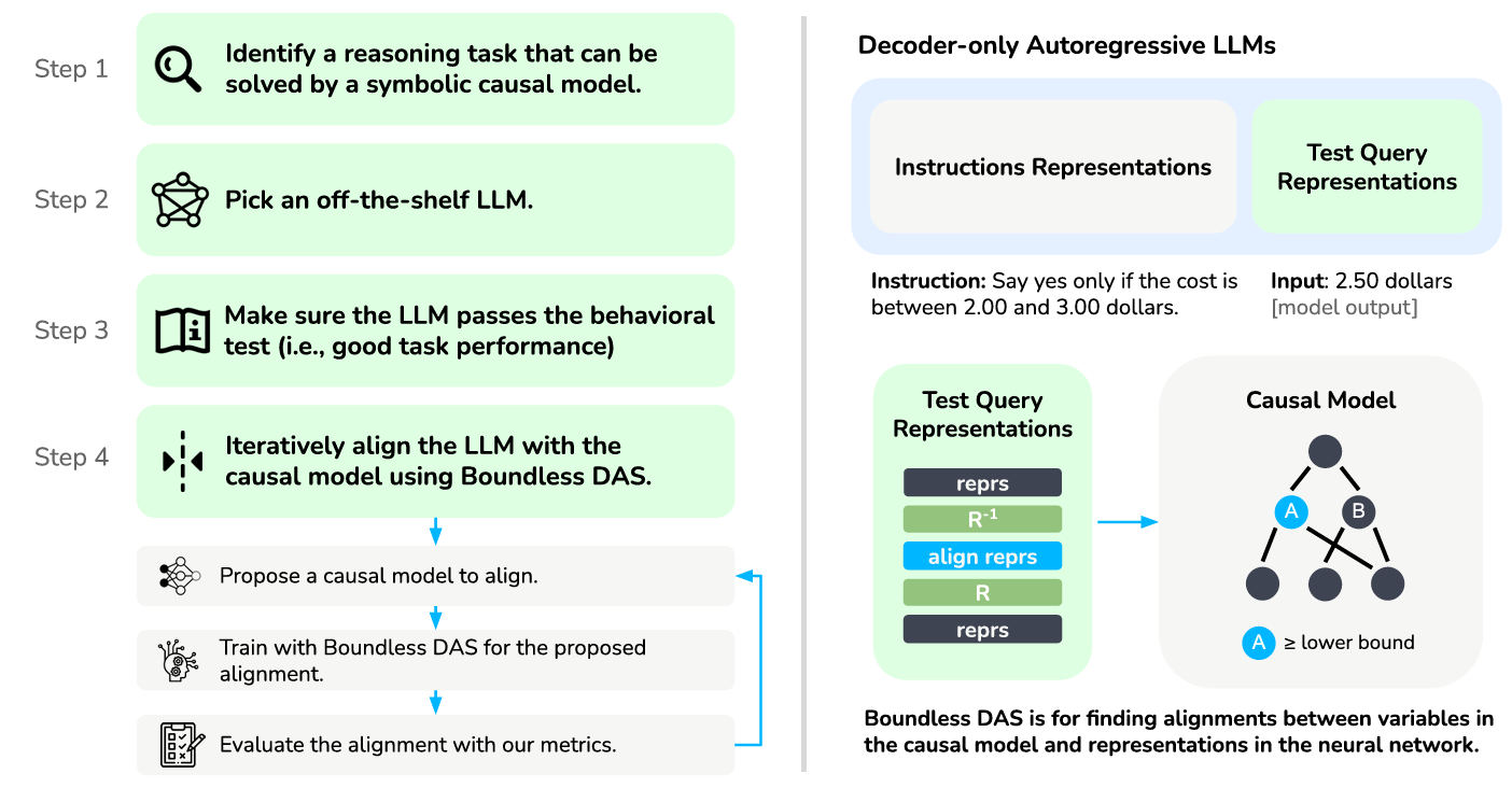 基于因果抽象理论,通过梯度下降让模型神经表示与可解释因果变量对齐,且对齐结果在输入、指令变化时仍稳定。