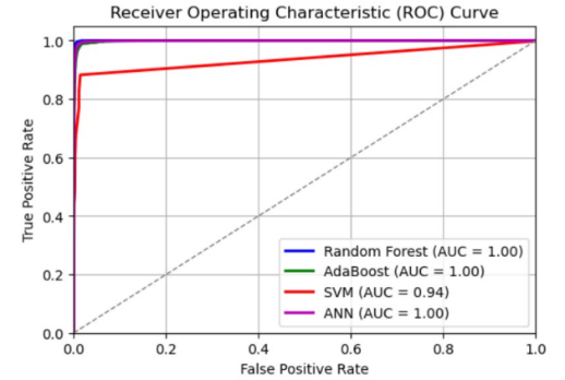 同时采用随机森林、AdaBoost、SVM和ANN四种不同类型的机器学习模型进行恶意软件检测,全面评估各类模型的检测性能。