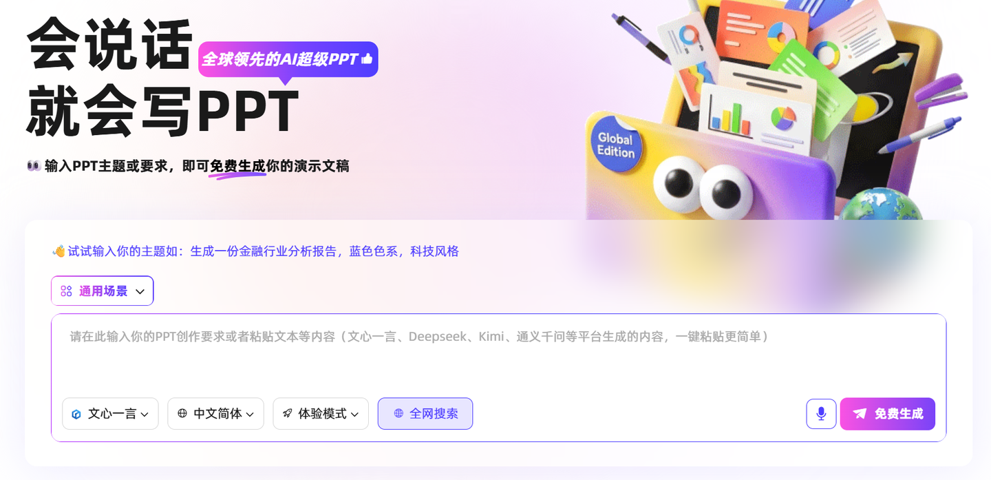 ChatPPT是一款专门针对PPT制作的ai生成ppt工具,主打"零基础也能快速上手",对新手非常友好。它的特色功能是能基于PPT内容自动生成逻辑清晰的演讲稿,这对需要进行汇报或答辩的新手来说,简直是"福音"。我曾用它制作毕业答辩PPT,生成PPT的同时还得到了一份完整的演讲稿,省去了我单独撰写演讲稿的时间。它的操作流程简单,输入主题后无需过多设置,就能生成完整的PPT,且每日可无限次生成,对学生党非常友好。