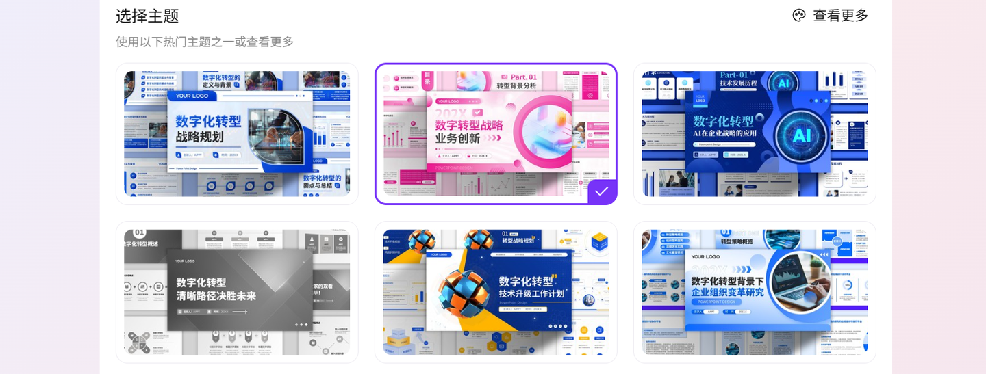- 本地化模板库丰富:内置海量符合国人审美的模板,覆盖商业、教育、科研等多个领域。模板设计专业,风格多样,能满足不同场景的使用需求。AI会根据内容类型自动匹配合适的模板,提升PPT制作效率。