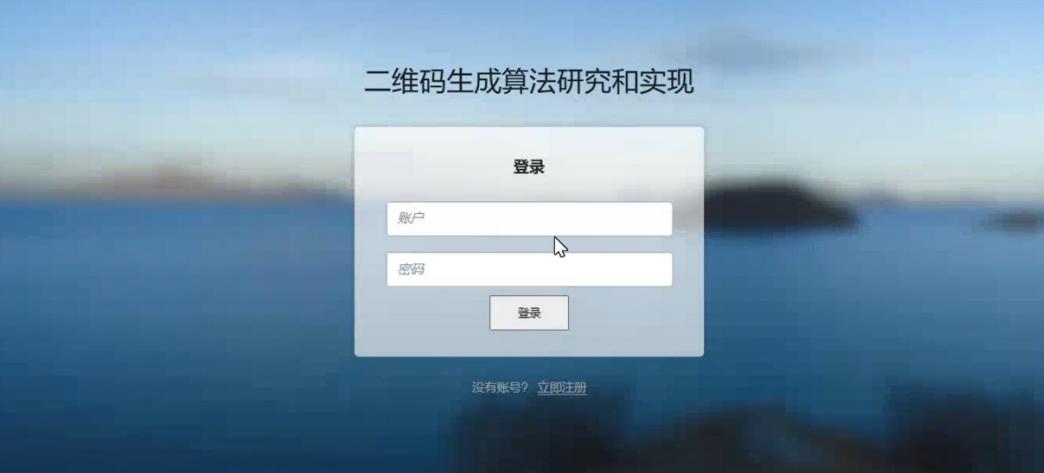 在二维码生成算法研究和实现的登录界面上,主要采用了动态背景呈现,需要用户录入正确的账户名和密码才可以实现平台的登录,没有账号的用户可以通过立即注册界面注册登录