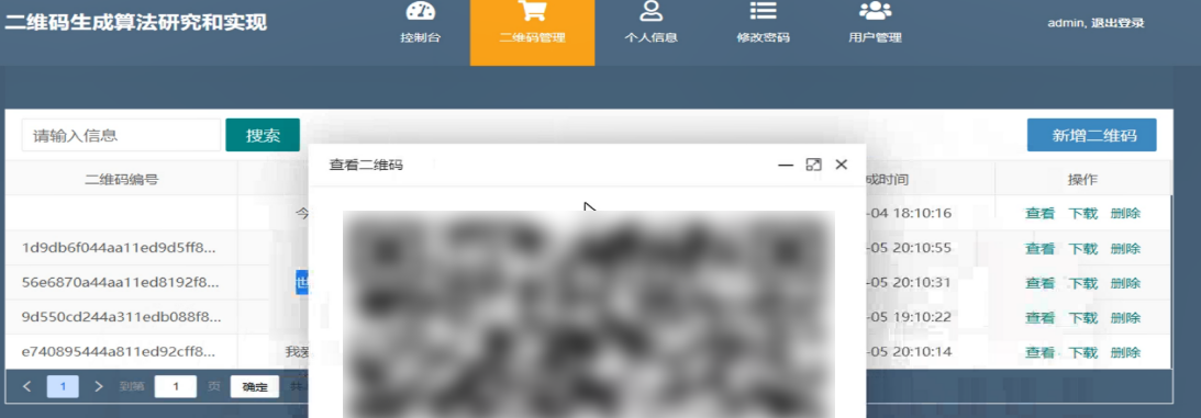二维码管理界面主要包含了二维码编号,标题,信息,创建人及生成时间等基本信息,可以查看、下载和删除对应的二维码信息,通过点击新增二维码,录入对应的标题和信息内容既可以生成对应的二维码编号和数据记录,通过点击查看即可以看到对应的二维码,通过下载界面也可以实现二维码的下载