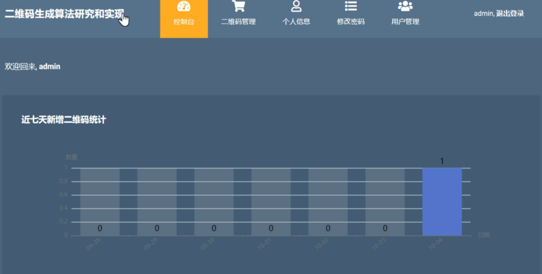 二维码平台首页的具体信息内容主要包括了控制台、二维码管理、个人信息、修改密码和用户管理,通过控制台可以看到近七天的新增二维码数量