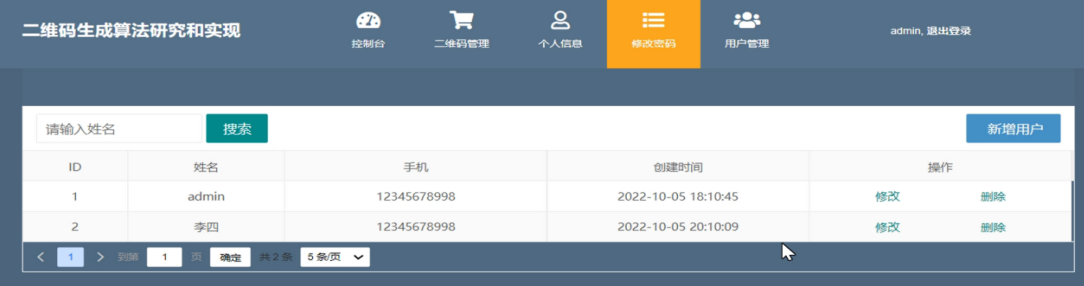 在用户管理界面可以实现用户的新增,管理员安可以通过该平台新增用户,需要录入对应的用户名及基本信息,同时还可以通过修改和删除的功能来实现用户的日常管理和维护