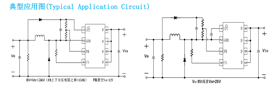 FB 引脚的分压电路设计不同(电容、电阻的连接方式调整),以适配更宽的电压范围。