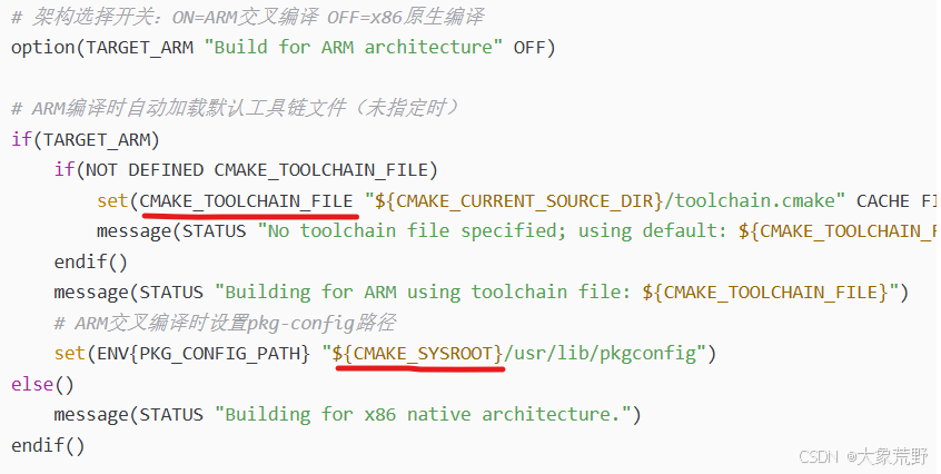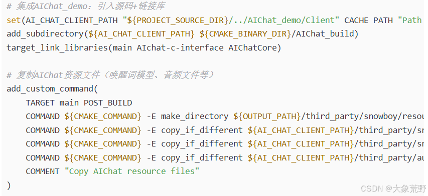 手动集成源码\],就是在子模块的 CMakeList中添加 json-c库的源码路径和编译过程,在编译静态子模块库的时候顺手把 json-c也静态编译了,然后引用。 \[交叉编译安装到 sysroot\] 其实就是先把 json-c编译了安装到 sysroot的 usr目录下,后面编译静态子模块库的时候就可以 `find_package()` 直接找到。 图方便,我们直接修改子模块的 CMakeList来手动集成 json-c源码,并对子模块使用静态编译,对子模块依赖的库使用动态编译,整体打包。 相同子模块的不同库,到最后一个库统一给出 CMakeList.txt文件。 ### 根目录的CMakeList 先从上到下,给出根目录的 CMakeList, ```bash cmake_minimum_required(VERSION 3.10) # 架构选择开关:ON=ARM交叉编译 OFF=x86原生编译 option(TARGET_ARM "Build for ARM architecture" ON) # ARM编译时自动加载默认工具链文件(未指定时) if(TARGET_ARM) if(NOT DEFINED CMAKE_TOOLCHAIN_FILE) set(CMAKE_TOOLCHAIN_FILE "${CMAKE_CURRENT_SOURCE_DIR}/toolchain.cmake" CACHE FILEPATH "Default toolchain file for ARM builds") message(STATUS "No toolchain file specified; using default: ${CMAKE_TOOLCHAIN_FILE}") endif() message(STATUS "Building for ARM using toolchain file: ${CMAKE_TOOLCHAIN_FILE}") # ARM交叉编译时设置pkg-config路径 set(ENV{PKG_CONFIG_PATH} "${CMAKE_SYSROOT}/usr/lib/pkgconfig") else() message(STATUS "Building for x86 native architecture.") endif() # 项目基础配置 project(DeskBot) set(CMAKE_C_STANDARD 99) # LVGL要求C99+ set(CMAKE_CXX_STANDARD 17) # C++17标准 set(CMAKE_CXX_STANDARD_REQUIRED ON) set(OUTPUT_PATH ${PROJECT_SOURCE_DIR}/bin) # 可执行文件/资源输出目录 # 引入子模块(LVGL核心、GUI应用、工具类、公共模块) add_subdirectory(lvgl) add_subdirectory(gui_app) add_subdirectory(utils) add_subdirectory(common) # LVGL头文件路径配置 target_include_directories(lvgl PUBLIC ${PROJECT_SOURCE_DIR} ${PROJECT_SOURCE_DIR}/conf) # 主程序构建:指定源文件+生成可执行文件 set(MAIN_SOURCES main.c) add_executable(main ${MAIN_SOURCES}) # 链接自定义模块依赖 target_link_libraries(main gui_app utils common) # 引入DRM库+SDL2/SDL2_image依赖(LVGL显示相关) include(${CMAKE_CURRENT_LIST_DIR}/lvgl/tests/FindLibDRM.cmake) include_directories(${Libdrm_INCLUDE_DIRS}) find_package(SDL2) find_package(SDL2_image) include_directories(${SDL2_INCLUDE_DIRS} ${SDL2_IMAGE_INCLUDE_DIRS}) # 链接系统/第三方库(LVGL、数学库、线程库等) target_link_libraries(main lvgl lvgl::examples lvgl::demos lvgl::thorvg ${SDL2_LIBRARIES} ${SDL2_IMAGE_LIBRARIES} ${Libdrm_LIBRARIES} m pthread) add_custom_target (run COMMAND ${OUTPUT_PATH}/main DEPENDS main) # 快捷运行目标 # 复制配置文件到输出目录(系统参数、高德编码、证书) add_custom_command(TARGET main POST_BUILD COMMAND ${CMAKE_COMMAND} -E copy_if_different ${PROJECT_SOURCE_DIR}/utils/system_para.conf ${OUTPUT_PATH}/system_para.conf COMMENT "Copy system_para.conf") add_custom_command(TARGET main POST_BUILD COMMAND ${CMAKE_COMMAND} -E copy_if_different ${PROJECT_SOURCE_DIR}/utils/gaode_adcode.json ${OUTPUT_PATH}/gaode_adcode.json COMMENT "Copy gaode_adcode.json") add_custom_command(TARGET main POST_BUILD COMMAND ${CMAKE_COMMAND} -E copy_if_different ${PROJECT_SOURCE_DIR}/utils/cacert.pem ${OUTPUT_PATH}/cacert.pem COMMENT "Copy cacert.pem") # 集成AIChat_demo:引入源码+链接库 set(AI_CHAT_CLIENT_PATH "${PROJECT_SOURCE_DIR}/../AIChat_demo/Client" CACHE PATH "Path to AIChat_demo Client") add_subdirectory(${AI_CHAT_CLIENT_PATH} ${CMAKE_BINARY_DIR}/AIChat_build) target_link_libraries(main AIchat-c-interface AIChatCore) # 复制AIChat资源文件(唤醒词模型、音频文件等) add_custom_command( TARGET main POST_BUILD COMMAND ${CMAKE_COMMAND} -E make_directory ${OUTPUT_PATH}/third_party/snowboy/resources/models ${OUTPUT_PATH}/third_party/audio COMMAND ${CMAKE_COMMAND} -E copy_if_different ${AI_CHAT_CLIENT_PATH}/third_party/snowboy/resources/common.res ${OUTPUT_PATH}/third_party/snowboy/resources/common.res COMMAND ${CMAKE_COMMAND} -E copy_if_different ${AI_CHAT_CLIENT_PATH}/third_party/snowboy/resources/models/echo.pmdl ${OUTPUT_PATH}/third_party/snowboy/resources/models/echo.pmdl COMMAND ${CMAKE_COMMAND} -E copy_if_different ${AI_CHAT_CLIENT_PATH}/third_party/audio/waked.pcm ${OUTPUT_PATH}/third_party/audio/waked.pcm COMMENT "Copy AIChat resource files" ) # ARM架构专属:集成yolov5_demo(AI摄像头) if(TARGET_ARM) # 引入yolov5源码+链接核心库 set(AI_CAMERA_PATH "${CMAKE_CURRENT_SOURCE_DIR}/../yolov5_demo" CACHE PATH "Path to yolov5_demo") add_subdirectory(${AI_CAMERA_PATH}/cpp ${CMAKE_BINARY_DIR}/AICamera_build) target_link_libraries(main yoloCameraCore) # 复制yolov5模型文件(图片、标签、rknn模型) add_custom_command( TARGET main POST_BUILD COMMAND ${CMAKE_COMMAND} -E make_directory ${OUTPUT_PATH}/model COMMAND ${CMAKE_COMMAND} -E copy_if_different ${AI_CAMERA_PATH}/model/bus.jpg ${OUTPUT_PATH}/model/bus.jpg COMMAND ${CMAKE_COMMAND} -E copy_if_different ${AI_CAMERA_PATH}/model/coco_80_labels_list.txt ${OUTPUT_PATH}/model/coco_80_labels_list.txt COMMENT "Copy yolov5 base model files" ) # 批量复制所有.rknn模型文件 file(GLOB RKNN_FILES "${AI_CAMERA_PATH}/model/*.rknn") foreach(RKNN_FILE ${RKNN_FILES}) get_filename_component(FILE_NAME ${RKNN_FILE} NAME) add_custom_command(TARGET main POST_BUILD COMMAND ${CMAKE_COMMAND} -E copy_if_different ${RKNN_FILE} ${OUTPUT_PATH}/model/${FILE_NAME} COMMENT "Copy ${FILE_NAME}") endforeach() # 复制ARM共享库(rga、rknnmrt)+创建lib目录 set(SHARED_LIBS "${AI_CAMERA_PATH}/cpp/3rdparty/librga/Linux/armhf_uclibc/librga.so" "${AI_CAMERA_PATH}/cpp/3rdparty/rknpu2/Linux/armhf-uclibc/librknnmrt.so") add_custom_command(TARGET main POST_BUILD COMMAND ${CMAKE_COMMAND} -E make_directory ${OUTPUT_PATH}/lib COMMENT "Create lib dir for shared libs") foreach(LIB_FILE ${SHARED_LIBS}) get_filename_component(FILE_NAME ${LIB_FILE} NAME) add_cust