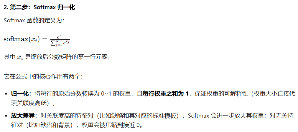 这个公式承担了自注意力机制中最关键的权重分配任务,分为两步执行,每一步都有明确的数学和工程意义。
