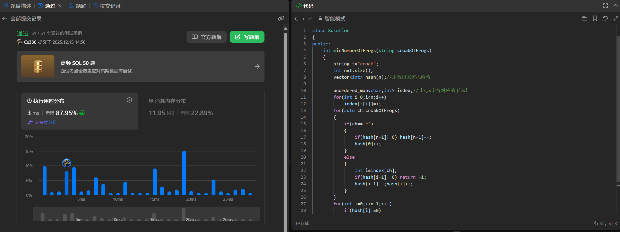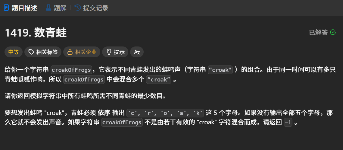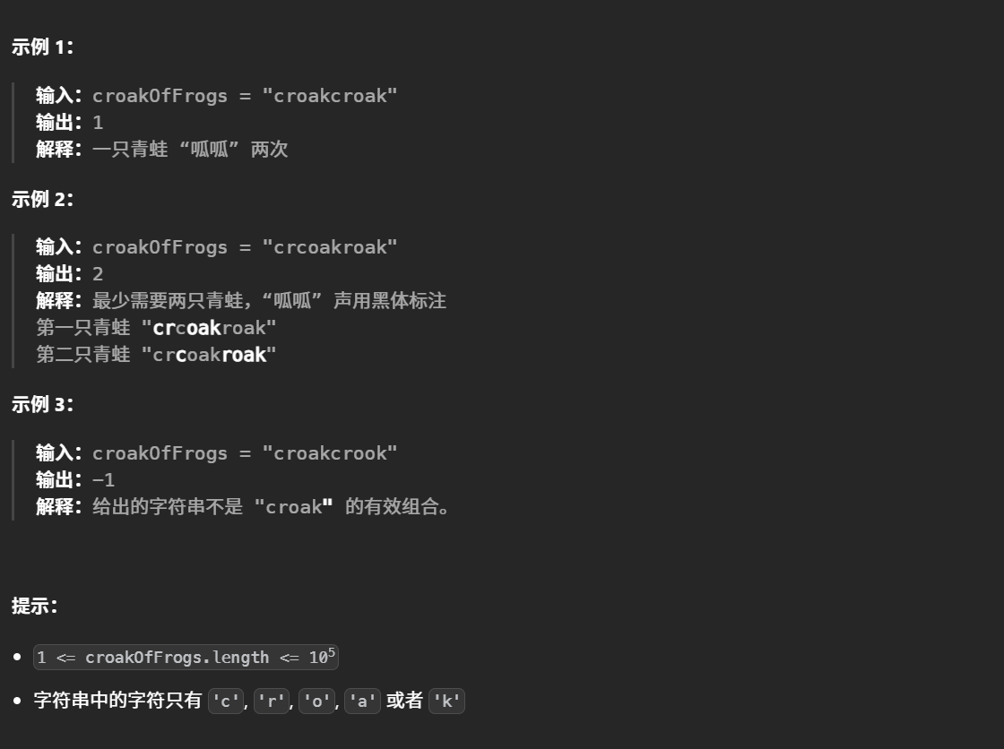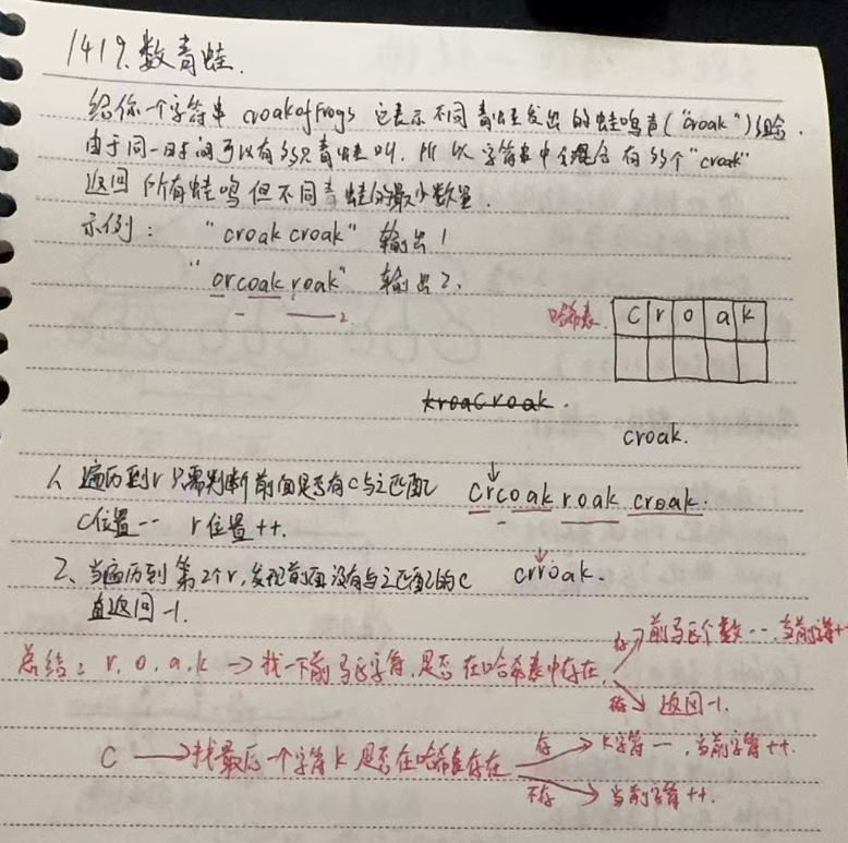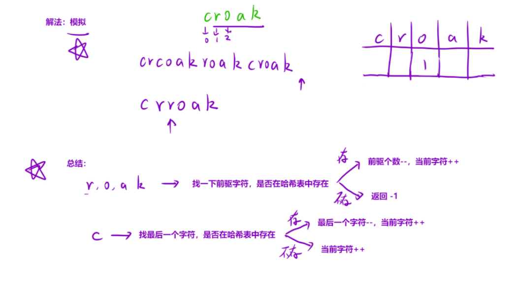 总结:算法核心是追踪"croak"序列的完成状态:遇到'c'时检查是否有完成叫声的青蛙可复用,否则新增青蛙;遇到其他字符时检查前驱字符是否存在。使用哈希表记录字符位置,数组跟踪各阶段叫声数量。若最终中间状态不为零或无法匹配前驱字符则返回-1
