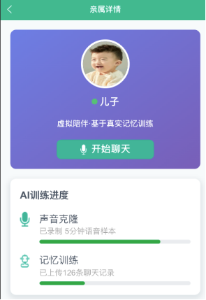 - 语音一键激活:不用学复杂操作,轻声呼唤"儿子""女儿"就能触发,虚拟形象贴近亲人模样,声音更是通过克隆技术还原的真实子女声线,聊家常、诉烦恼都像亲人在身边。