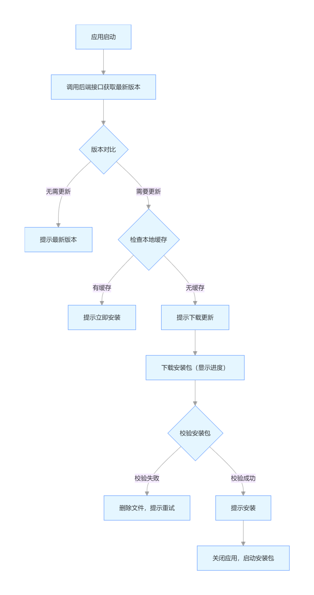 不管是Android端还是Windows端,更新流程都遵循下面这套统一逻辑,保证两端用户的更新体验一致: