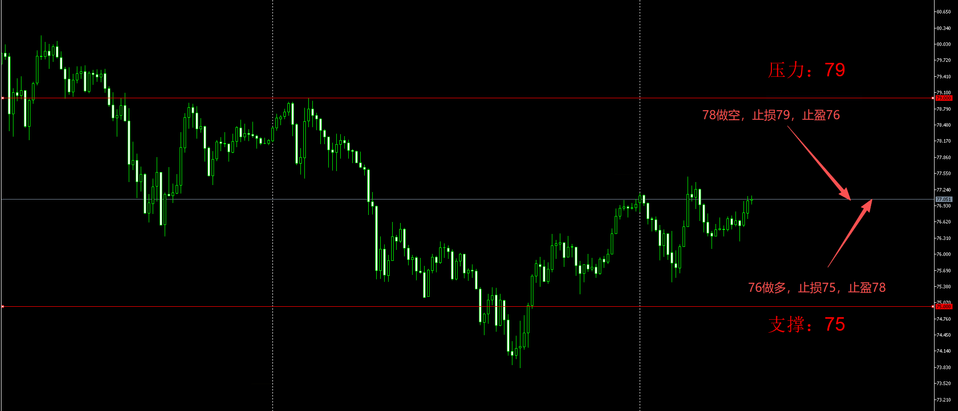 关键区间:75.000 - 79.000美元