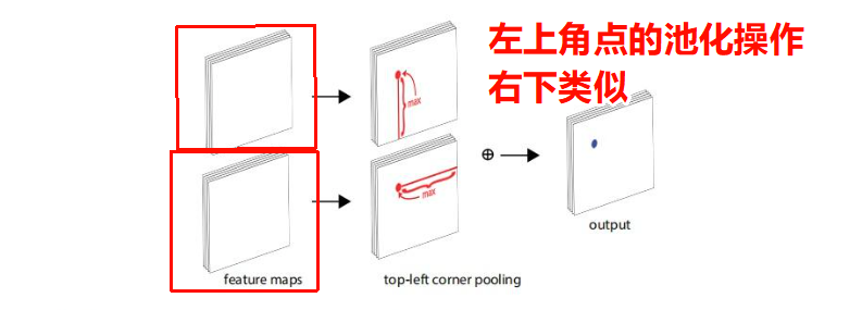 CornerNet将目标的检测问题转换为角点检测问题(左上和右下角点确认了之后,整个目标就确定了)。为此,论文提出了角点池化的操作。一个目标框的角点一般是在目标之外的,不能基于局部特征来定位角点,需要从横向和纵向的方向分别来查找最上面的边界和最左边的边界来定位左上角的角点。这就是corner pooling的灵感。它使用2个特征图,每一个像素位置上,使用第一个特征图向右取得最大的池化特征,使用第二个特征图向下取得最大池化特征,然后再把2个特征向量相加。如下图所示: