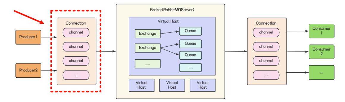 **Channel: ** 信道、通道。Channel是在Connection之上的抽象层,在Rabbit MQ中,一个TCP连接中,即一个Connection中可以有多个Channel,每个Channel都是独立的虚拟连接,消息的发送和接收都是基于Channel的。