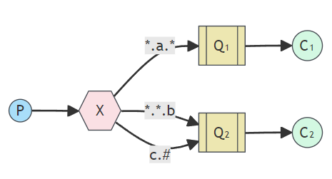 - Topic: 通配符。将消息交给符合routing pattern的队列(通配符模式)。