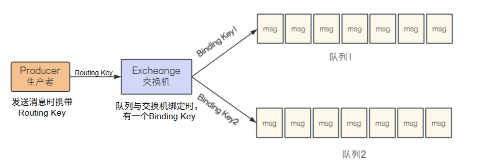 生产者在发送消息的时候会携带一个Routing Key,交换机就会将消息发送给 Routing Key 和 Binding Key 能匹配上的队列。