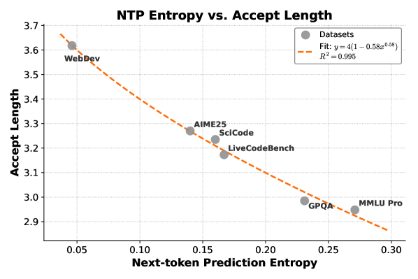 图 7:下一个 Token 的交叉熵与 MTP 平均接受长度呈强负相关------熵越低(任务越确定),接受的 Token 越多