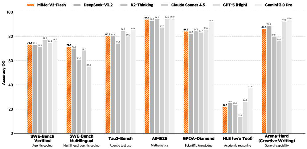 图 1:MiMo-V2-Flash 在多个基准测试上的性能表现,与 DeepSeek-V3.2、Kimi-K2、GPT-5 等模型的对比