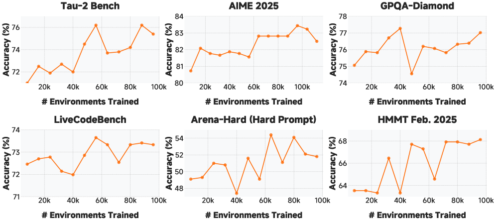 关键发现 :在代码代理任务上的 RL 训练,能够泛化到数学推理、通用问答等其他领域,说明代码能力是一种"元能力"。