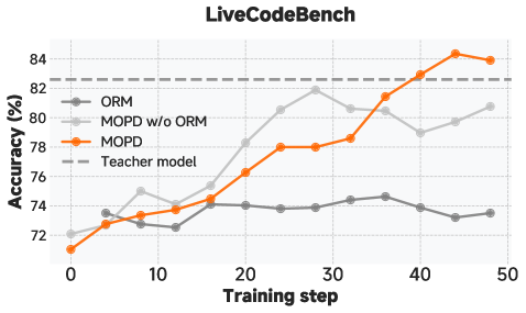 关键发现 :MOPD 后的学生模型在多个任务上超越了最佳教师!这说明多教师蒸馏能够产生 1+1>2 的效果。