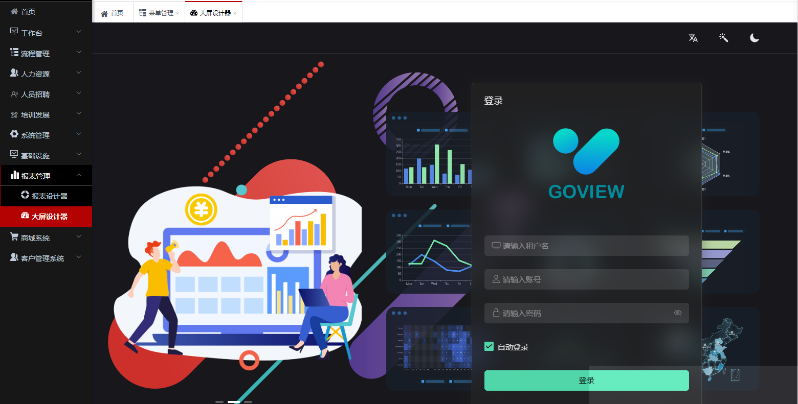 ruoyi-vue-pro 的已经集成了数据大屏模块go-view,并且用vue开发了前端,可以进行拖来拽就能实现一个精美的数据大屏应用,然而点击【报表管理->大屏设计】你却发现需要输入账号密码登陆,这多少有点遗憾。