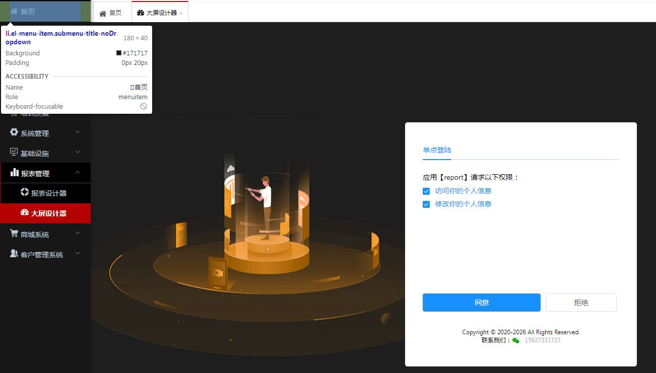这个页面是yudao-vue-pro中的src\views\sso.vue,这里我只是改了下样式,这个页面应该不需要改动。同意授权后页面会自动跳转到数据大屏的首页,如下图: