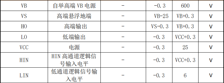 - 高端悬浮地(VS):电压范围 VB-25V 至 VB+0.3V,耐压裕量较同系列稍大