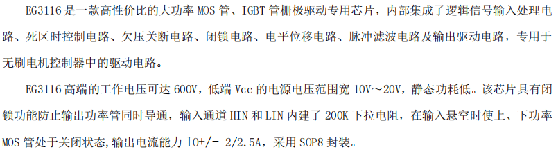 - 关键变化:与EG3113(HIN高有效,LIN低有效)和EG3113D(同EG3113)不同,EG3116的双输入均为高有效,逻辑控制更直观对称,悬空时均默认低电平(关断)