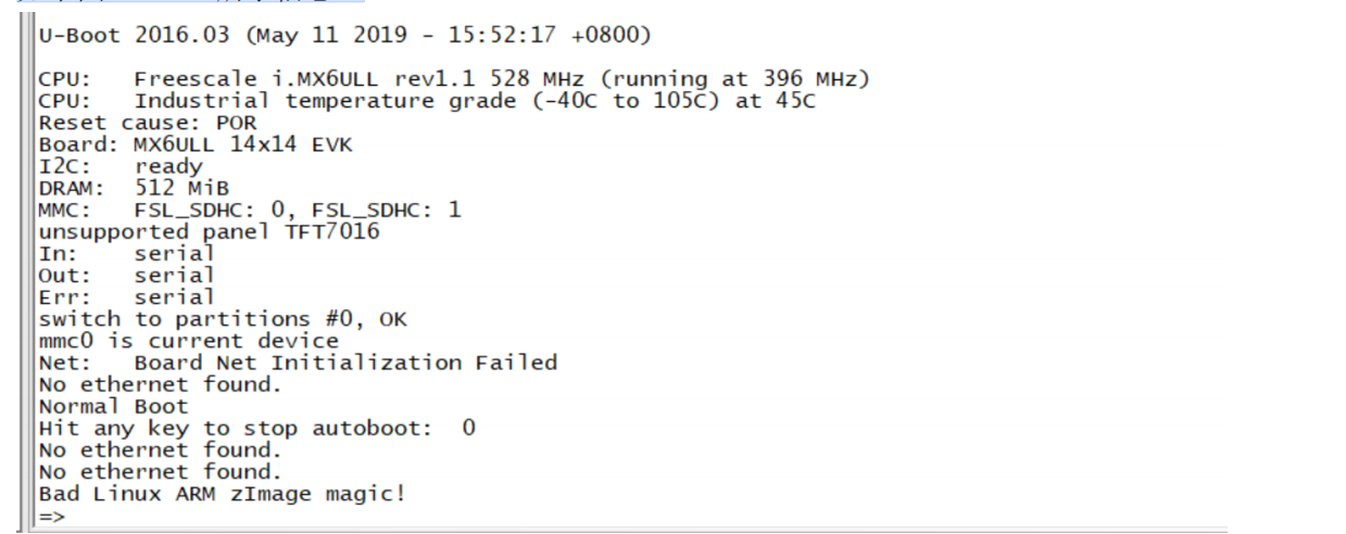 可以看出,uboot 启动正常,虽然我们用的是 NXP 官方 I.MX6ULL 开发板的 uboot,但是在正点原子的 I.MX6ULL 开发板上是可以正常启动的。而且 DRAM 识别正确,为512MB,如果用的 NAND 版本的核心版的话 uboot 启动会失败!因为 NAND 核心版用的 256MB的 DRAM。