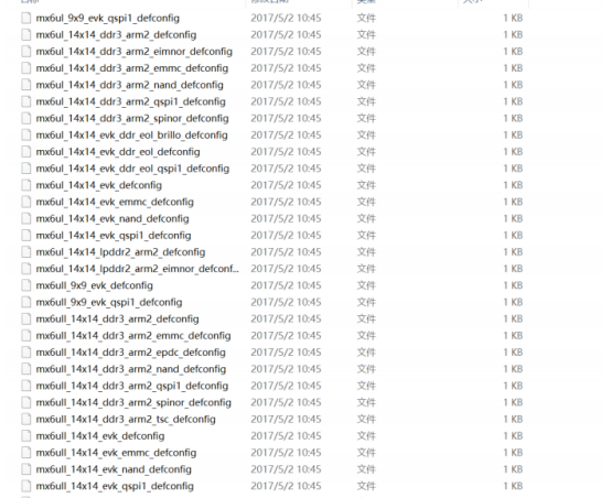 我们用的 I.MX6ULL 开发板为 14x14mm 芯片,且分 EMMC、NAND 版本,只需关注 mx6ull_14x14_evk_emmc_defconfig 和 mx6ull_14x14_evk_nand_defconfig;本次讲解 EMMC 版本移植,选 mx6ull_14x14_evk_emmc_defconfig 作为默认配置文件。