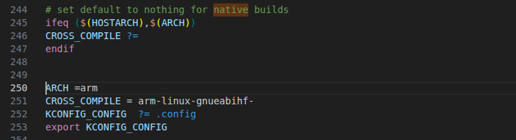 上图 3 中的 250 、 251 行就是直接给 ARCH 和 CROSS_COMPILE 赋值,这样我们就可