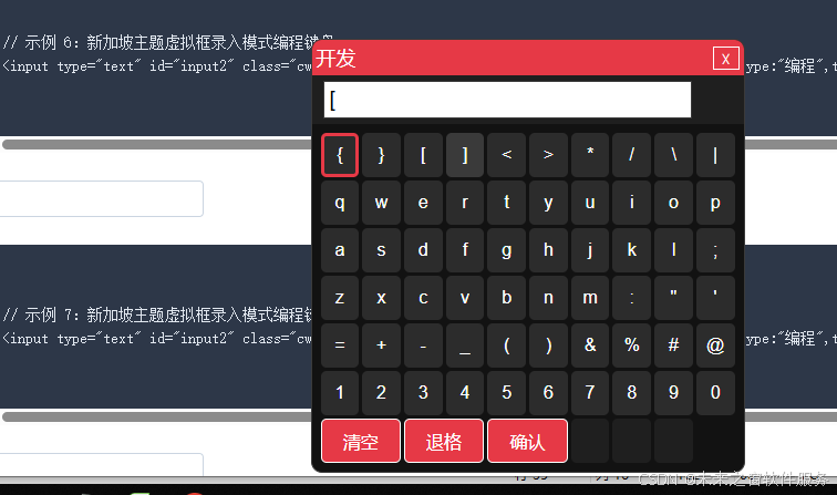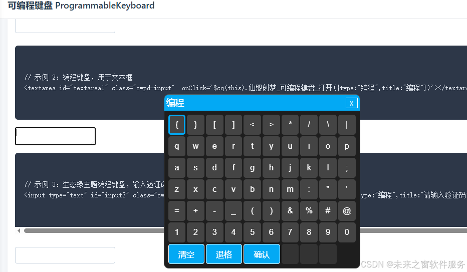 <input type="text" id="input2" class="cwpd-input" onClick='$cq(this).仙盟创梦_可编程键盘_打开({type:"编程",title:"开发",theme:"新加坡",mode:"虚拟框",remote:false})'>