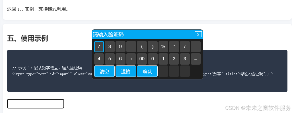 <input type="text" id="input2" class="cwpd-input" onClick='$cq(this).仙盟创梦_可编程键盘_打开({type:"编程",title:"请输入验证码",theme:"生态绿"})'>