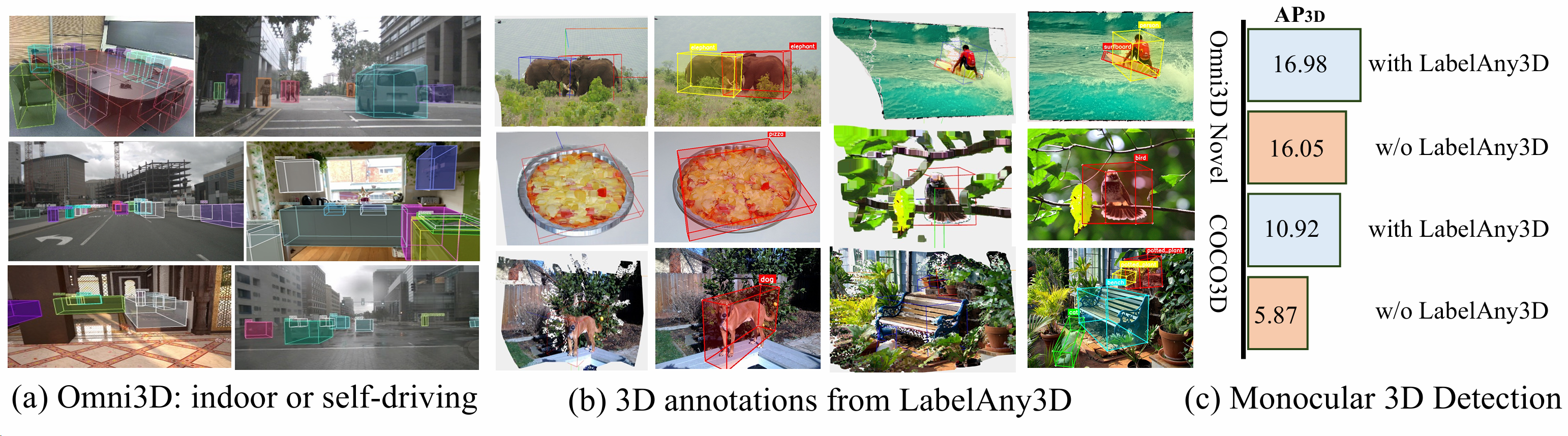 图 2:概述。(a) Omni3D [7] 提供了大规模的 3D 标注,但主要覆盖室内和自动驾驶场景。(b) 提出的 LabelAny3D 重建 3D 场景(左)以标注物体 3D 边界框(右)。© 利用 LabelAny3D 的伪标签训练单目 3D 检测器,提高了其在 Omni3D 新类别 [75] 和我们新的 COCO3D 基准测试上的 AP3D\mathrm{AP}_{3\mathrm{D}}AP3D(平均精度;越高越好)。