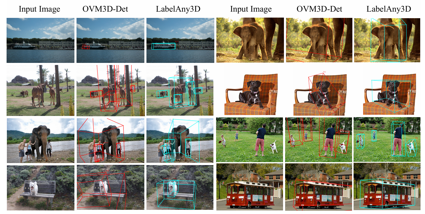 LabelAny3D 实现了更好的伪标注 。表 2 将 LabelAny3D 与 OVM3D-Det [27] 在伪标注质量上进行了比较。LabelAny3D 在所有报告的指标上始终优于基线。自动生成和人工细化标注之间的 AP3D\mathrm{AP}{3\mathrm{D}}AP3D 为 64.17,表明需要最少的人工修正,证明了我们流程的效率。图 6 提供了与 OVM3D-Det [27] 的视觉比较,揭示了在物体尺寸和形状变化很大的真实世界设置中,基于度量先验的局限性------即使在同一类别内(例如,幼年大象、儿童和船)。在这种情况下,度量深度估计容易不准确,导致结果错位。相比之下,LabelAny3D 利用相对深度和网格重建来生成外观一致的 3D 边界框,从而获得更高的标注保真度。我们进一步比较了 LabelAny3D 和 OVM3D-Det [27] 在 KITTI [24] 基准测试上生成的伪标注质量。LabelAny3D 实现了更高的总体 AP3D\mathrm{AP}{3\mathrm{D}}AP3D,为 13.6,而 OVM3D-Det 为 12.39。值得注意的是,在卡车类别上,LabelAny3D 显著优于 OVM3D-Det,AP3D\mathrm{AP}_{3\mathrm{D}}AP3D 为 32.74 vs. 13.46,突显了其有效性。